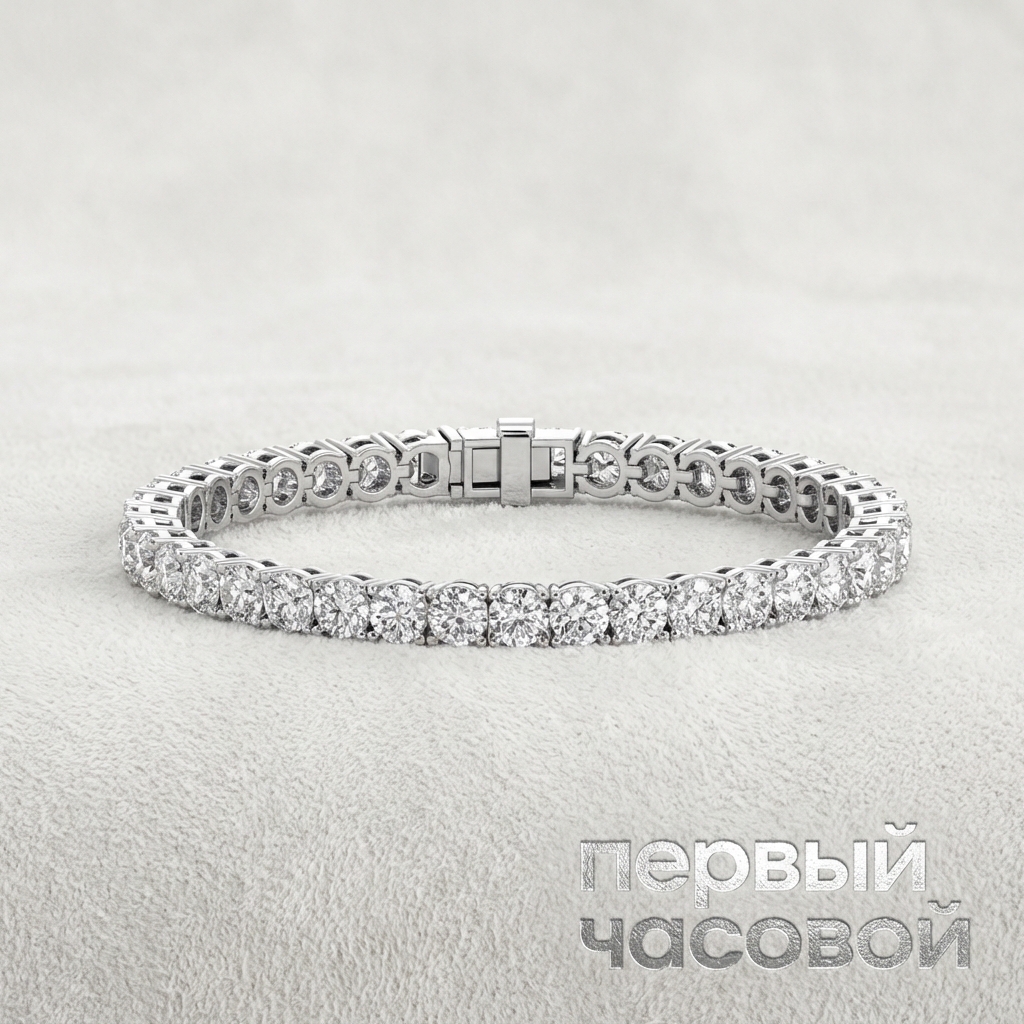 Браслет Studio jewelry являет собой образец высокого ювелирного искусства, где примат отдан исключительным характеристикам минералов. Композиция изделия выстроена по классическому принципу riviera, объединяя 25 бриллиантов общим весом 22,4 карата в непрерывную световую линию. Каждый камень массой порядка 0,90 ct демонстрирует эталонную огранку «Triple Excellent», обеспечивающую безупречную симметрию граней и максимальную сцинтилляцию: свет проникает через площадку и, преломляясь в павильоне, возвращается наблюдателю яркими вспышками дисперсии. Цветовой диапазон G-H в сочетании с чистотой VS гарантирует отсутствие видимых включений и холодный, «ледяной» оттенок, а параметр флюоресценции NONE свидетельствует о полной прозрачности кристаллической решетки без паразитных оптических эффектов. Оправа из белого золота 750 пробы сведена к конструктивному минимуму: крапановая закрепка надежно удерживает камни, оставаясь практически невидимой, чтобы ничто не отвлекало от природной игры света.