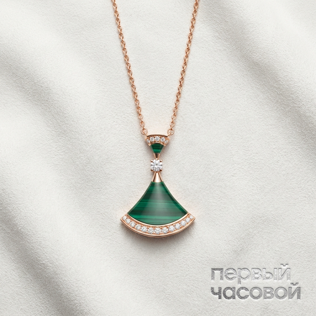 Серьги Bvlgari из знаковой коллекции Diva’s Dream демонстрируют эталонную работу с поделочными минералами, где архитектурная форма веера, вдохновленная мозаиками терм Каракаллы, воплощена в теплом розовом золоте 750 пробы. Доминантой композиции выступает малахит с характерным зонально-концентрическим рисунком и глубоким сатиновым блеском, чья природная текстура контрастирует с идеальной полировкой металла. Вершина каждого элемента инкрустирована бриллиантом классической огранки в глухой закрепке, переходящей в деликатное паве, что при общей массе 0,28 карата обеспечивает точечную сцинтилляцию и подчеркивает статику зеленого минерала. Безупречное качество лигатуры и строгая симметрия исполнения подтверждают высокий статус ювелирного дома, превращая изделие в образец современного ювелирного искусства.
