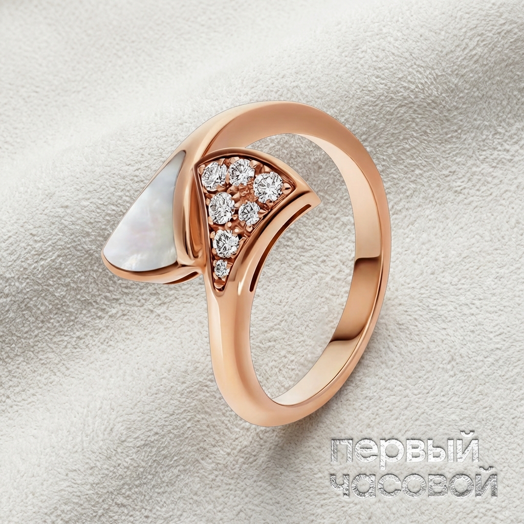 Кольцо Bvlgari из знаковой коллекции Bvlgari Bvlgari воплощает синтез римской архитектурной эстетики и ювелирного мастерства. Изделие выполнено из розового золота 750 пробы, чей теплый тон гармонично обрамляет вставку из натурального белого перламутра, демонстрирующего глубокий, шелковистый ориент. Геометрия круга, вдохновленная античными монетами, дополнена сегментом с бриллиантовым паве весом 0,08 карата, которое привносит в матовую текстуру перламутра акцентированную сцинтилляцию и живую игру света. Гравировка двойного логотипа на рундисте служит неотъемлемым маркером ДНК бренда, подтверждая статус изделия. Безупречное качество закрепки и полировки металла превращает это украшение в образец современного ювелирного искусства.