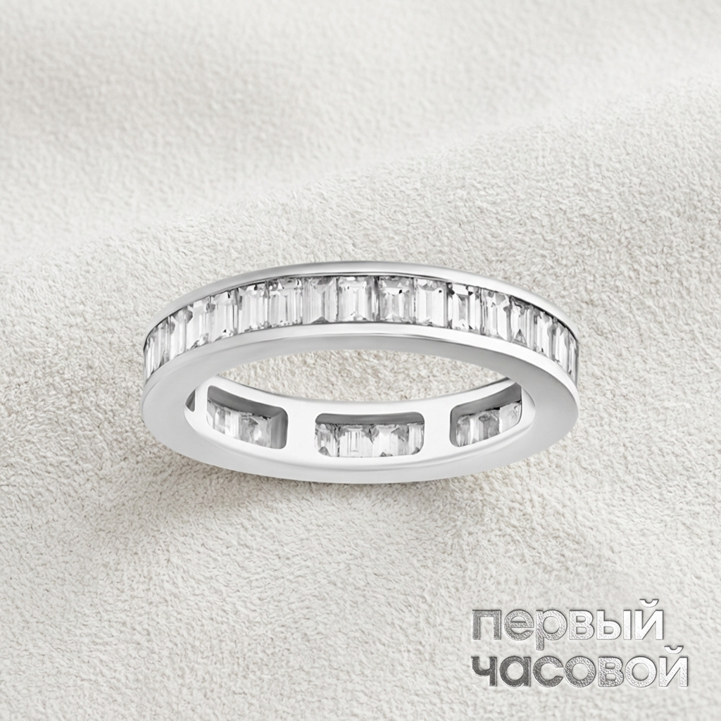 Кольцо Studio jewelry представляет собой монументальную композицию, где безусловной доминантой выступает исключительный подбор драгоценных камней. Ансамбль из 30 бриллиантов общей массой 6,10 карата демонстрирует характеристики Fine White/VS, что гарантирует эталонную прозрачность и высокую степень светопреломления. Благодаря отсутствию инклюзий, видимых без увеличения, дисперсия света в гранях достигает максимума, создавая непрерывную сцинтилляцию и выраженный «огонь» по всей окружности изделия. Оправа из белого золота с гальваническим родиевым покрытием выполняет роль нейтрального фона, усиливая холодный блеск минералов и визуально растворяясь в их сиянии. Технически безупречная закрепка обеспечивает надежную фиксацию каждого элемента, формируя идеальную геометрию шинки 17 размера.