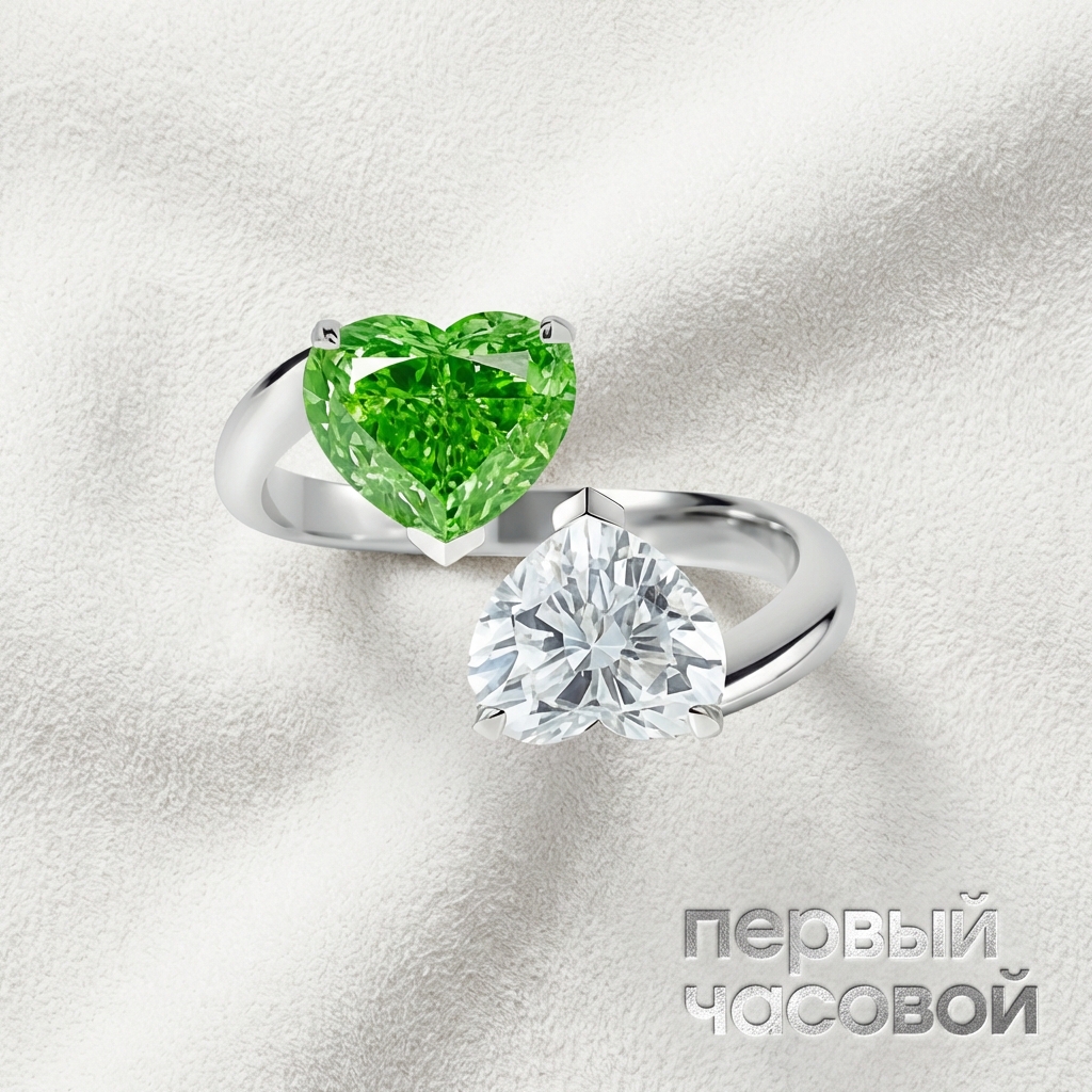Кольцо Studio jewelry являет собой исключительный образец ювелирного дуализма, вероятно, воплощенного в классической концепции Toi et Moi. Композиция изделия построена на драматическом и в то же время гармоничном контрасте двух бриллиантов фантазийной огранки «Сердце», чья сложная архитектура требует эталонной симметрии граней для достижения максимального светопреломления. Первый солитер весом 1.52 карата обладает высокими инвестиционными характеристиками цвета F и чистоты VVS2, демонстрируя ледяную прозрачность и безупречную сцинтилляцию без видимых включений. Его визави — редкий экземпляр весом 1.51 карата с природной фантазийной окраской Fancy Brownish Greenish Yellow, чья сложная колористика раскрывается глубокой игрой оливковых и янтарных полутонов в зависимости от угла падения света. Оправа из белого золота 750 пробы, покрытая родием, выполняет исключительно функциональную роль: минималистичная крапановая закрепка оставляет открытым павильон и рундист камней, позволяя световому потоку беспрепятственно проходить сквозь кристаллическую решетку и усиливать естественную дисперсию минералов.