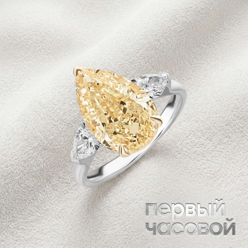 Кольцо Studio jewelry являет собой образец высокого ювелирного искусства, где главенствующую роль играет монументальный центральный бриллиант весом 5,00 карата. Огранка камня мастерски раскрывает природный оттенок Light Yellow, создавая мягкую, теплую дисперсию и интенсивную сцинтилляцию, в то время как чистота VS2 обеспечивает прозрачность кристаллической решетки и беспрепятственное прохождение света через площадку к павильону. Центральный солитер фланкирован боковыми бриллиантами общей массой 1,01 карата с высокими характеристиками H/VS, холодное сияние которых создает необходимый оптический контраст. Архитектоника изделия выполнена в биколорном золоте 750 пробы: использование желтого сплава в касте виртуозно подчеркивает тон центральной вставки, а шинка из белого золота придает композиции строгую геометрическую завершенность и музейную статику.