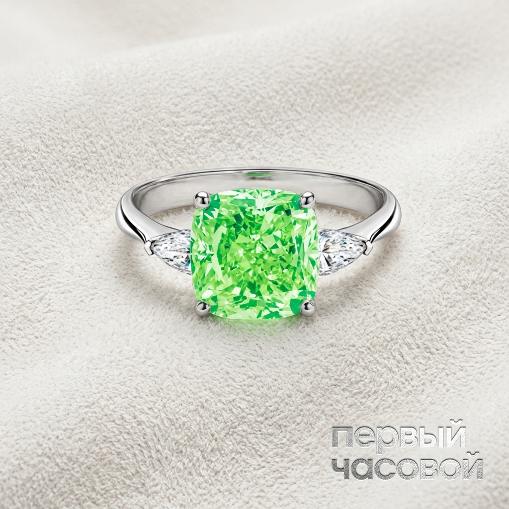 Кольцо Studio jewelry представляет собой эталон работы с инвестиционными камнями, где во главу угла поставлена природная уникальность минерала. Доминантой строгой архитектурной композиции выступает массивный бриллиант весом 7,52 карата редкого оттенка Fancy Brownish Greenish Yellow. Глубокая дисперсия света в массиве камня рождает сложную колористическую игру, сочетающую теплые золотистые и холодные оливковые тона, характерные для фантазийных алмазов чистоты VS2. Центральный солитер фланкирован двумя бриллиантами огранки «Груша» общей массой 1,01 ct с характеристиками цвета D и чистоты VS1, создающими контрастную ледяную сцинтилляцию. Оправа из белого золота 750 пробы выполнена технически безупречно: крапановая закрепка минимизирует присутствие металла, открывая доступ свету к павильону и рундисту камней для максимального оптического эффекта.
