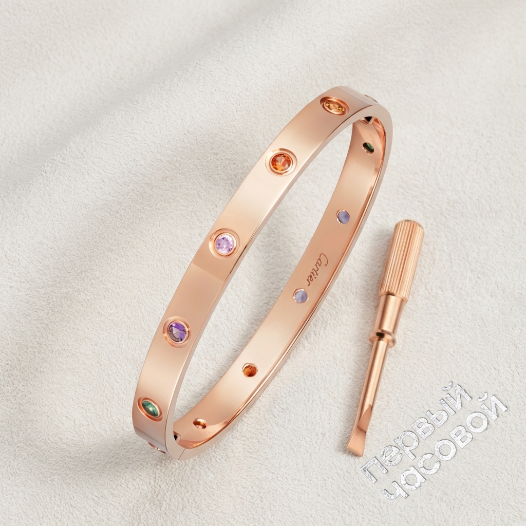 Браслет Cartier из легендарной коллекции LOVE являет собой хрестоматийный пример ювелирного конструктивизма, воплощенного в розовом золоте 750 пробы. Строгая геометрия изделия, ставшая неотъемлемой частью ДНК французского дома, смягчается теплой лигатурой металла и зеркальной полировкой поверхности. В тело браслета интегрирован полихромный ансамбль драгоценных камней: аметист, гранат, а также розовый и желтый сапфиры. Глухая закрепка обеспечивает идеальную гладкость внешнего контура, позволяя свету взаимодействовать с площадками камней для создания точечной сцинтилляции без излишней агрессивности. Каждый минерал подобран по чистоте и насыщенности, создавая ритмичный цветовой акцент, который контрастирует с утилитарной эстетикой винтовых мотивов.