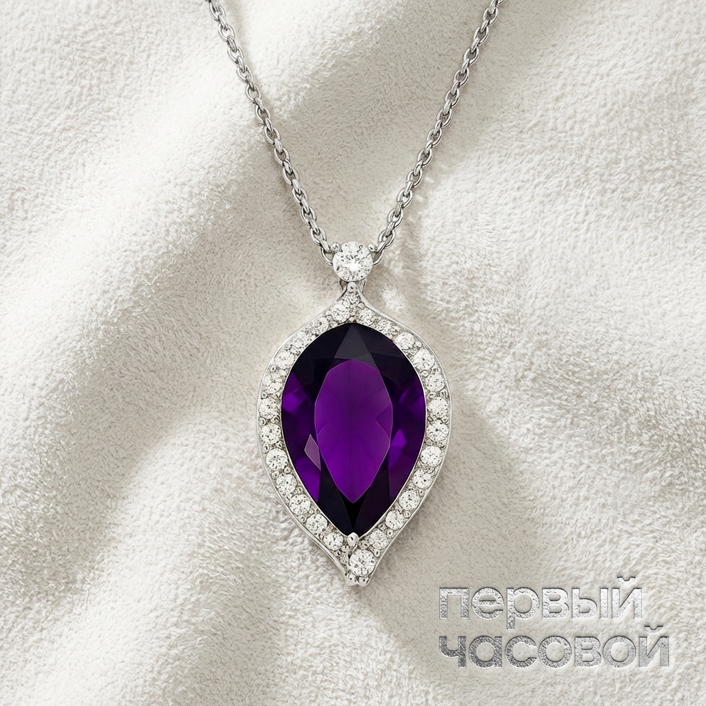 Ювелирное изделие Studio jewelry являет собой образец высокого ювелирного искусства, где природная уникальность минералов преобладает над маркетинговыми нарративами. Композиционным центром выступает монументальный аметист весом 51,20 карата, чья колористическая характеристика Very Deep Purple свидетельствует о редкой насыщенности и бархатистой глубине оттенка, раскрывающегося в фасетках павильона. Архитектоника украшения выстроена на контрасте: сумеречный фиолет центральной вставки обрамлен каскадом из 30 бриллиантов общей массой 5,15 карата, высокая сцинтилляция которых создает эффект динамического светового ореола. Оправа выполнена из платины — инертного и тугоплавкого металла, чей холодный люстр подчеркивает ледяную чистоту бриллиантов и обеспечивает бескомпромиссную надежность закрепки столь массивных камней.