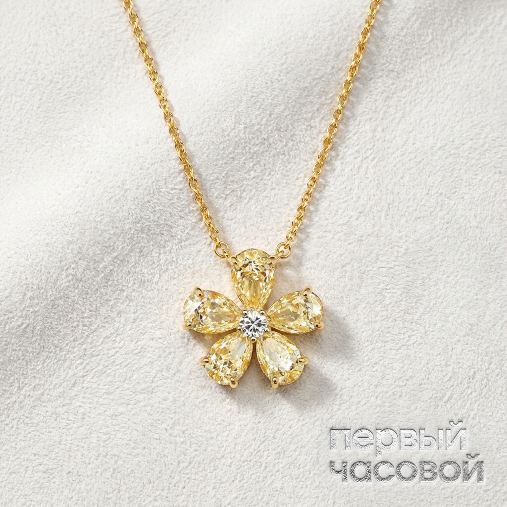 В данном случае мы имеем дело с классической схемой «умной покупки»: вы платите за физический вес и качество сырья, а не за воздух и брендбук известного дома. Это Studio jewelry, но наличие коробки и документов закрывает все вопросы по юридической чистоте и соответствию заявленным параметрам. Ключевой актив — это пять грушевидных бриллиантов общим весом 3 карата с чистотой VS; это серьезная заявка, так как камни визуально чистые, без «угля» и трещин. Цвет Faint Yellow — прагматичный выбор: легкий нацвет идеально маскируется желтым золотом 750 пробы, что позволяет получить крупную каратность дешевле, чем в бесцветном диапазоне, при этом визуальный эффект остается дорогим. Мелкий камень с чистотой I1 здесь не делает погоды, он просто технический элемент. Это честное вложение денег в золото и крупные камни хорошей чистоты.
