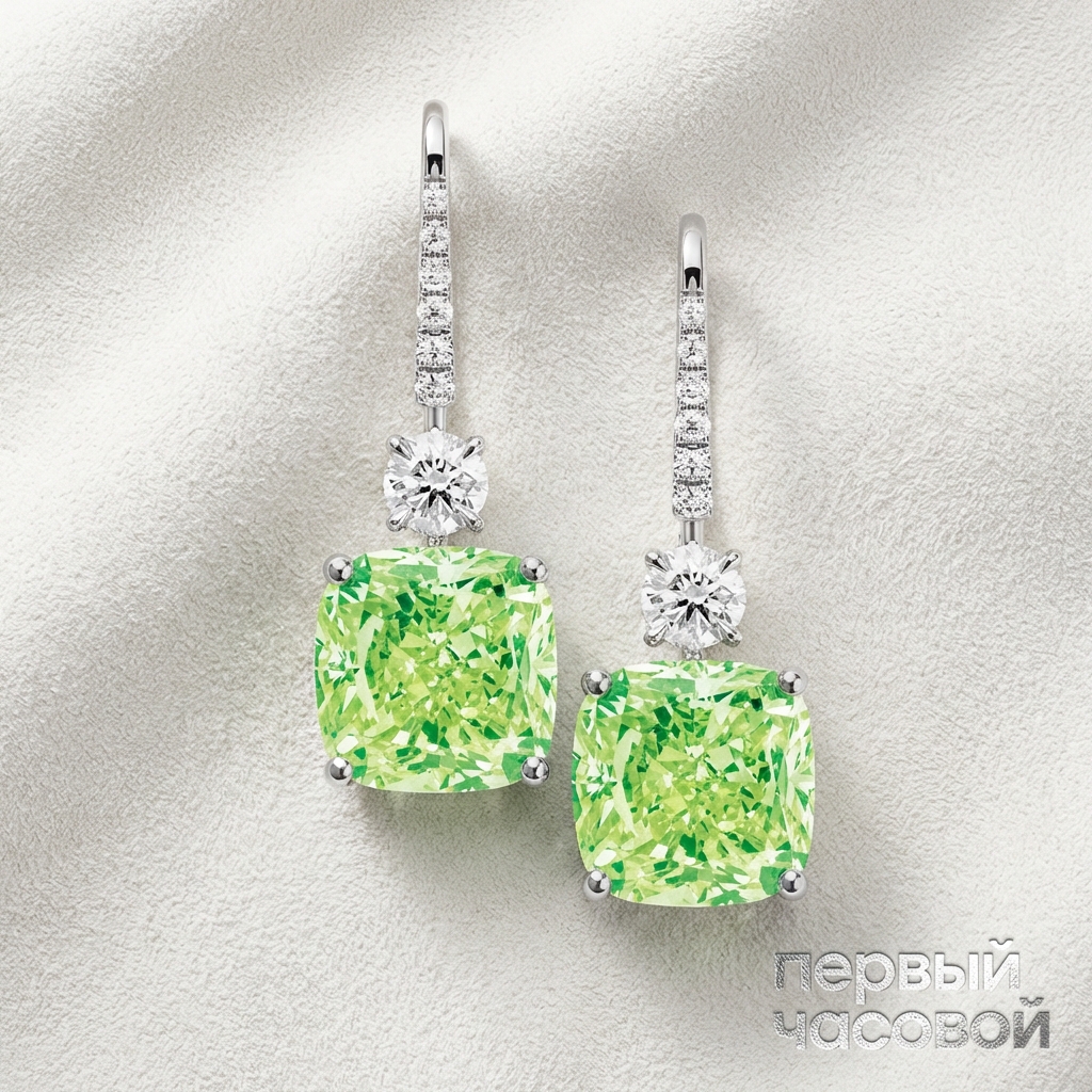 Серьги Studio jewelry представляют собой эталонный образец работы с редкими фантазийными бриллиантами высокой каратности. Композиционный центр изделия формирует пара уникальных минералов весом 2,51 и 2,61 карата, обладающих сложной колористической характеристикой Fancy Light Brownish Greenish Yellow. Благодаря высокой чистоте VS1, свет беспрепятственно проникает в глубину павильона, рождая завораживающую сцинтилляцию с переливами оливковых и золотистых оттенков. Архитектура оправы выполнена из белого золота 750 пробы, чья холодная зеркальная поверхность усиливает теплоту центральных вставок. Инкрустация бриллиантовым паве вокруг основных камней создает эффект оптического гало, визуально увеличивая площадь свечения и подчеркивая геометрию огранки.