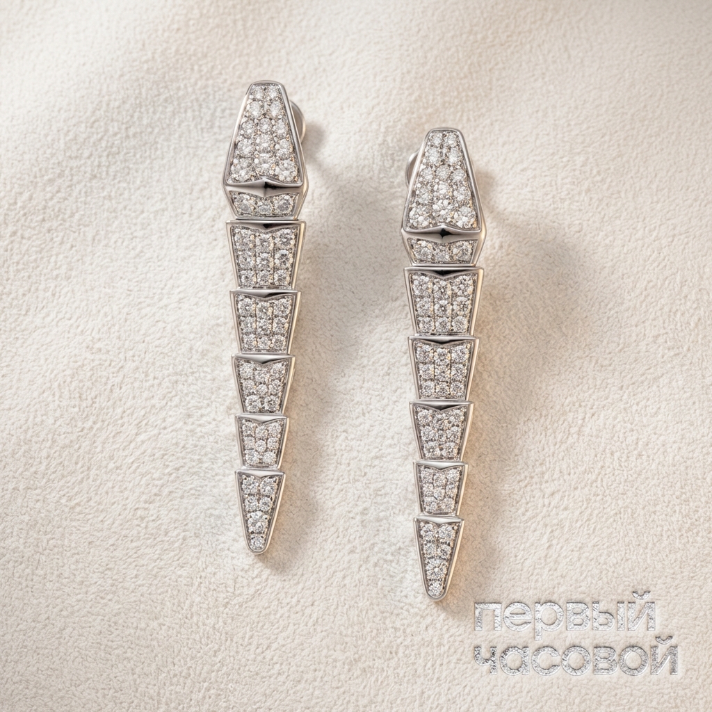 Ювелирное изделие Bvlgari воплощает собой эталонную архитектуру римского ювелирного дома, где холодная эстетика белого золота 750 пробы служит идеальным каркасом для световой игры. Композиция построена на безупречной геометрии металла, усиленной глубоким родированием для создания зеркального эффекта поверхности. Главный акцент сделан на бриллиантовой инкрустации общей массой 2.08 карата: геммологический подбор камней демонстрирует идентичные характеристики цвета и чистоты, обеспечивая равномерную сцинтилляцию и высокую дисперсию по всей площади паве. Огранка вставок выполнена с соблюдением строгих пропорций павильона и площадки, что позволяет «огню» камня максимально раскрываться при динамическом освещении. Это произведение демонстрирует характерный для Bvlgari баланс между монументальностью формы и легкостью светоотражения.