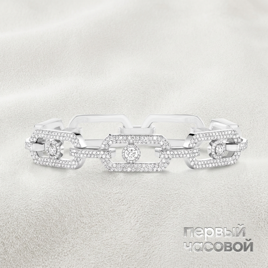 Браслет Messika из знаковой коллекции So Move XL являет собой эталон современной ювелирной архитектоники, воплощенной в холодном сиянии белого золота 750 пробы. Центральный мотив изделия с геометрическими параметрами 22 на 11 мм инкрустирован плотным бриллиантовым паве, создающим эффект непрерывного светового потока благодаря высокой дисперсии и сцинтилляции камней общей массой 3.28 ct. Характеристики G/VS гарантируют отсутствие видимых включений и высокую степень прозрачности, что позволяет свету беспрепятственно проходить сквозь грани, раскрывая «огонь» минералов. Узнаваемый ДНК бренда прослеживается в подвижном центральном элементе, чья динамика меняет угол преломления лучей при движении, создавая живую игру бликов на фоне статичной безупречности крапановой закрепки окружения.