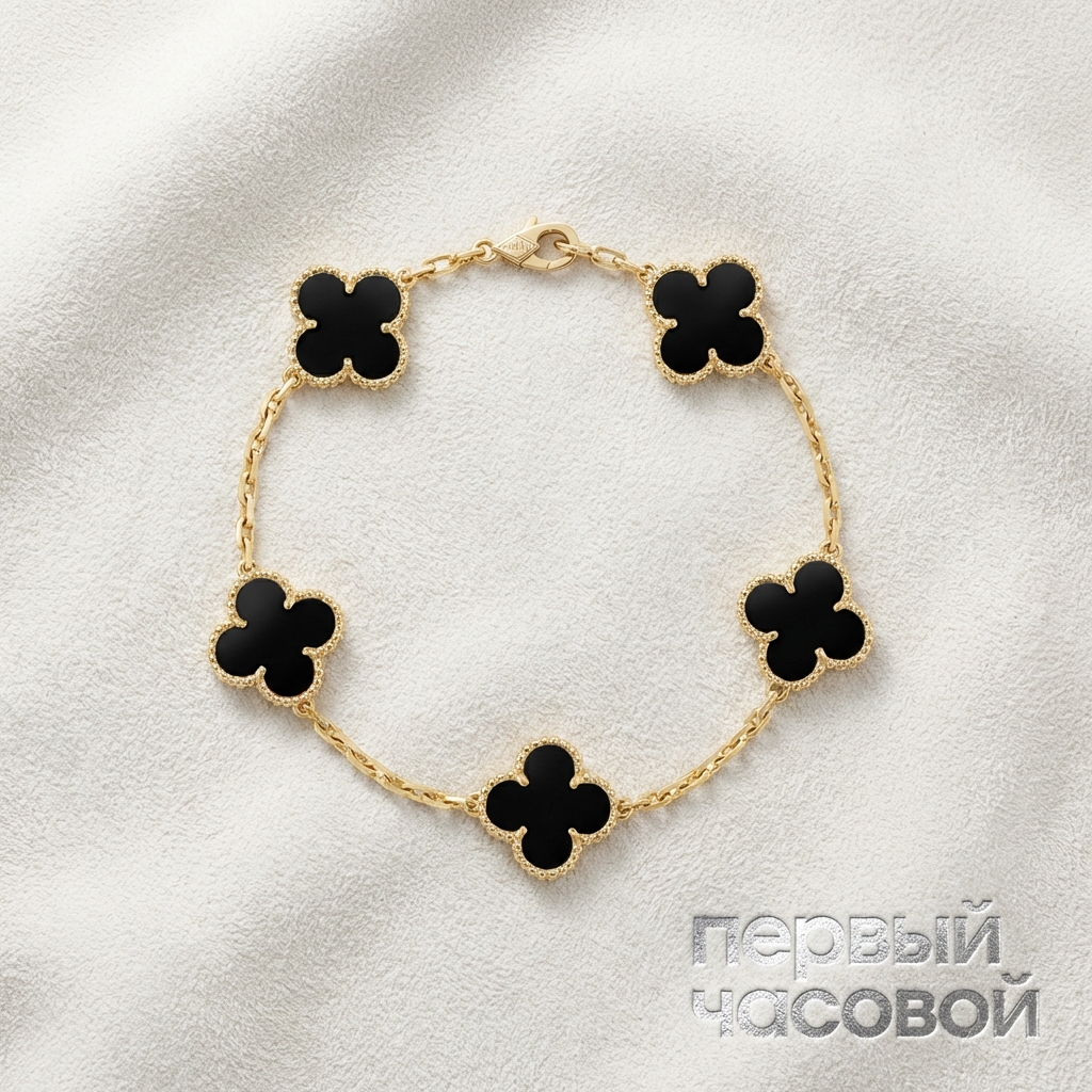 Браслет Van Cleef & Arpels из знаковой коллекции Vintage Alhambra являет собой эталон ювелирного пуризма, воплощенный в ритмичном чередовании пяти мотивов. В качестве вставок использован черный оникс исключительной однородности; поверхность минерала доведена до зеркального глянца, создающего эффект абсолютной глубины и поглощения света. Каждый элемент заключен в оправу из желтого золота 750 пробы, декорированную по периметру фирменной золотой зернью — техникой, ставшей частью исторического ДНК французского Дома. Архитектоника изделия демонстрирует безупречный баланс между теплым блеском металла и строгой геометрией камня, а надежная система соединений звеньев гарантирует идеальную посадку на запястье.