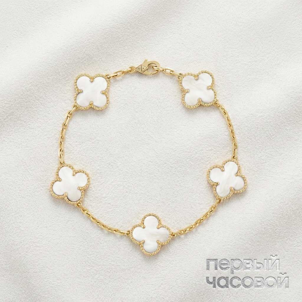 Браслет Van Cleef & Arpels Vintage Alhambra являет собой эталон узнаваемой эстетики дома, интерпретирующей символ удачи через призму высокого ювелирного искусства. Архитектура изделия строится на ритмичном чередовании пяти мотивов-четырехлистников, выполненных из желтого золота 750 пробы и обрамленных знаковой окантовкой в технике perlé, где каждая золотая сфера отполирована до зеркального блеска. Центральное место в композиции занимает белый перламутр высшей категории, чья ламеллярная структура обеспечивает глубокий, сатиновый блеск и деликатную иризацию, видимую при малейшем изменении угла падения света. Каждая вставка подобрана геммологами бренда с исключительной строгостью по тону и чистоте поверхности, исключая малейшие дефекты слоев арагонита. Соединение элементов выполнено посредством эргономичной цепной конструкции, гарантирующей идеальное прилегание к запястью.