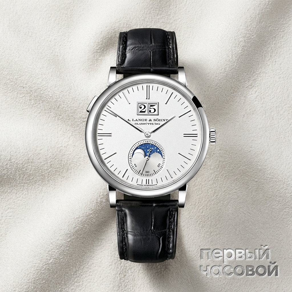 A. Lange & Sohne Saxonia Moon Phase представляет собой образец саксонского часового пуризма, где архитектурная строгость сочетается с высокоточной механикой. Корпус диаметром 40 мм выполнен из 18-каратного белого золота и отличается характерной для мануфактуры трехсоставной конструкцией с припаянными ушками, обеспечивающими идеальную геометрию посадки. Циферблат из цельного серебра служит фоном для двух доминирующих компликаций: фирменного указателя «Большой даты» в золотой рамке у отметки «12 часов» и высокоточного индикатора фаз Луны, интегрированного в малую секундную стрелку.