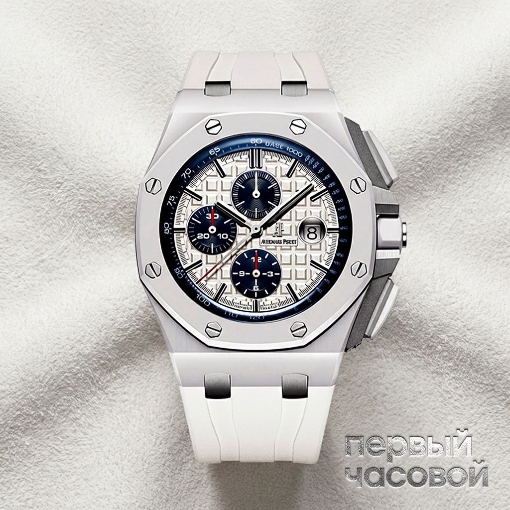 По эргономике это классический 44-миллиметровый «кирпич» от AP. На запястье сидят высоко, плотно, под манжету костюма не зайдут, да и не должны. Механизм 3126/3840 — это надежная база 3120 с накладным модулем хронографа Dubois Dépraz. Конструкция проверенная, «тракторная», хотя обслуживание модуля в будущем влетит в копейку. Единственное слабое место — белый каучук, который со временем может впитывать красители от одежды, поэтому носить с дешевой джинсой не советую. В остальном — это ультимативный вариант для лета и выходного дня, который не теряет в цене из-за неаккуратной носки.