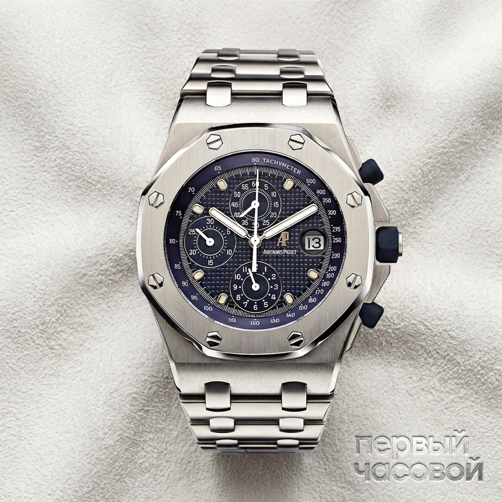 Audemars Piguet Royal Oak Offshore представляет собой монументальный образец часового конструктивизма, определивший вектор развития спортивных хронографов конца XX века. Корпус диаметром 42 мм, выполненный из нержавеющей стали, отличается сложной архитектурой с чередованием вертикального сатинирования и полированных фасок, создающих выраженную игру света на гранях. Знаковый восьмиугольный безель с открытыми винтами и видимой прокладкой уплотнителя подчеркивает индустриальную эстетику и герметичность конструкции до 100 метров. Циферблат, декорированный фирменным гильоше Tapisserie, обеспечивает контрастный фон для счетчиков хронографа и апертуры даты, защищенных сапфировым стеклом. Внутри массивного корпуса, оснащенного защитой от магнитных полей, работает калибр 2226/2840 — модульный механизм с автоподзаводом, базирующийся на проверенной временем архитектуре. Интегрированный стальной браслет продолжает геометрию корпуса, формируя единый монолитный облик.