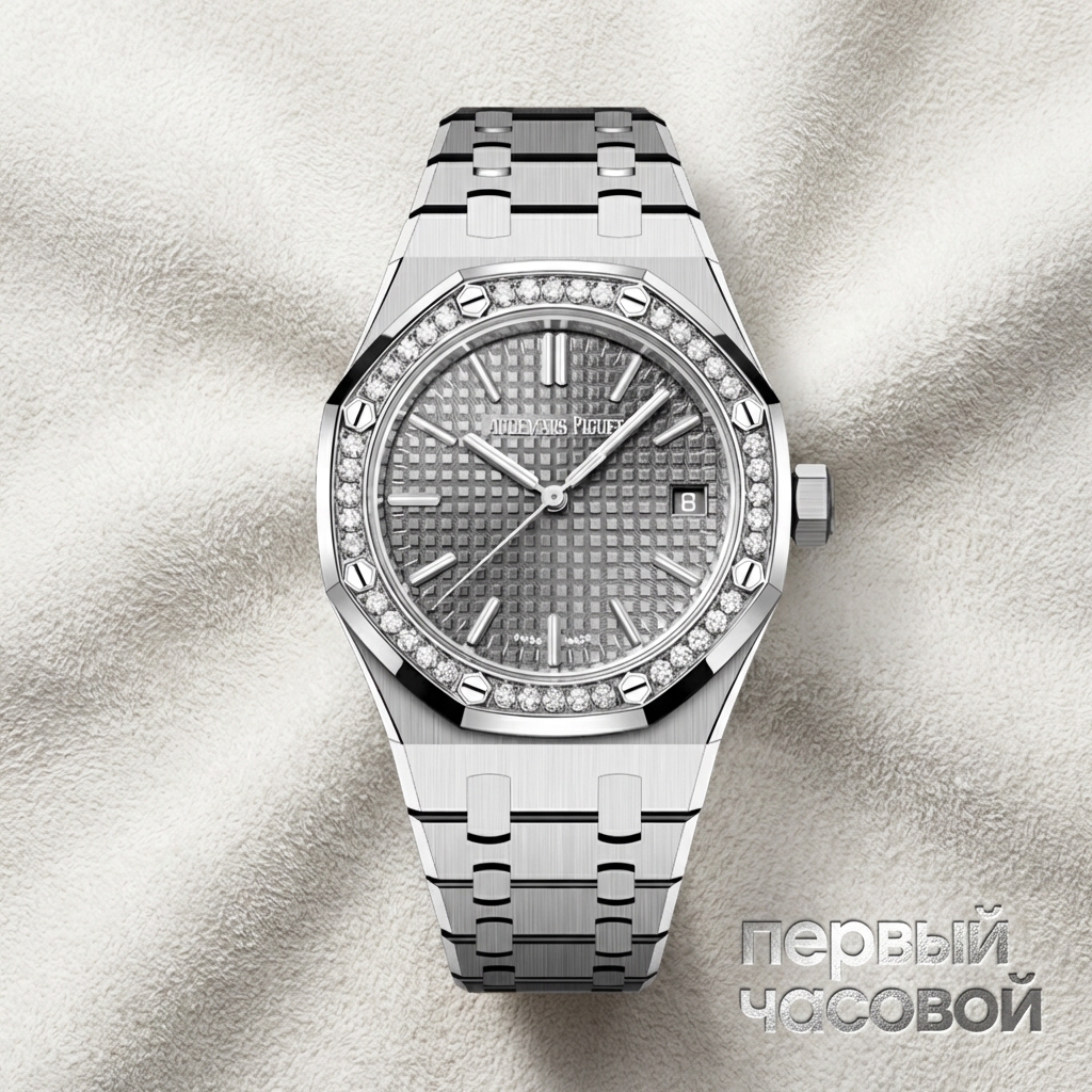 Audemars Piguet Royal Oak Selfwinding представляет собой эталонную интерпретацию спортивного шика в компактном корпусе диаметром 37 мм. Архитектура часов сохраняет канонические коды коллекции: корпус из нержавеющей стали с чередованием сатинированных поверхностей и полированных вручную фасок переходит в интегрированный браслет сложной геометрии. Ключевой визуальной доминантой выступает восьмиугольный безель, инкрустированный 40 бриллиантами классической огранки, которые создают активную игру света, контрастирующую с индустриальной эстетикой стальных винтов. Циферблат украшен фирменным гильоше «Grande Tapisserie», служащим фоном для накладных часовых меток и стрелок из белого золота с люминесцентным покрытием. Внутри установлен мануфактурный калибр 5900 — механизм нового поколения с автоматическим подзаводом, отличающийся уменьшенной толщиной (3,9 мм) и повышенной частотой баланса 4 Гц. Запас хода составляет 60 часов, а сапфировая задняя крышка позволяет детально рассмотреть ротор из 22-каратного розового золота и финишную отделку мостов.
