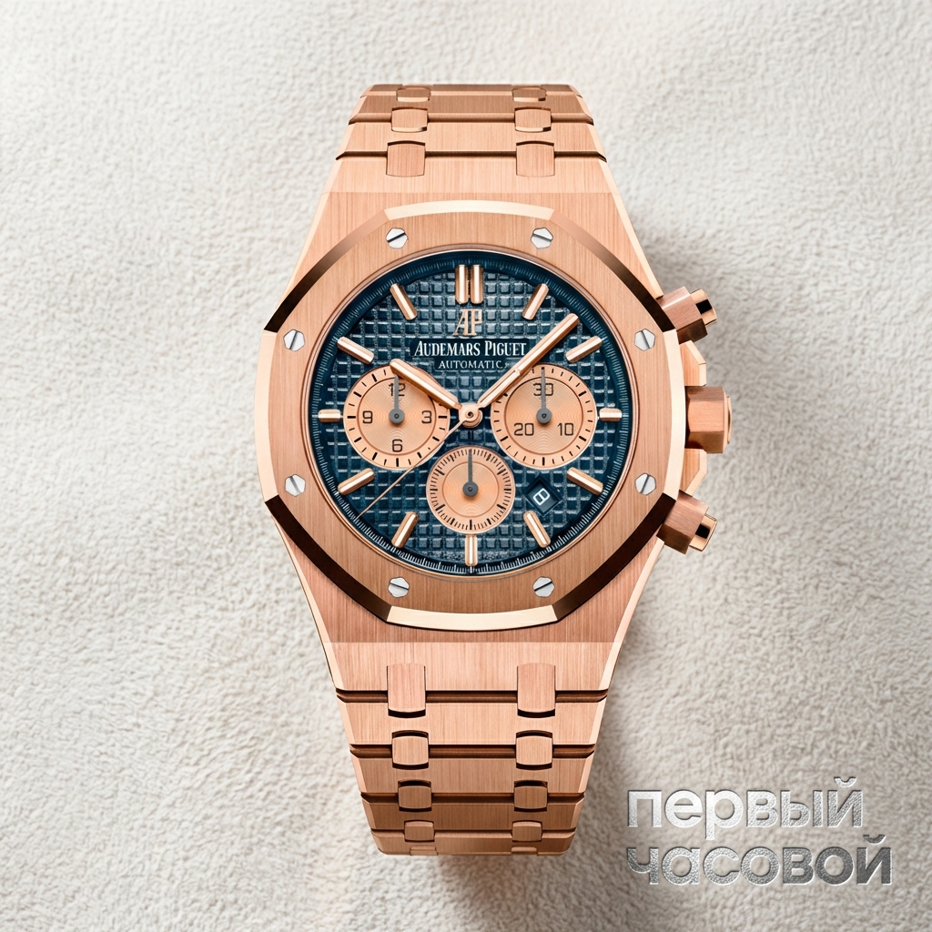 Audemars Piguet Royal Oak Chronograph воплощает собой архитектурную строгость и механическое совершенство в корпусе из 18-каратного розового золота диаметром 41 мм. Знаковый восьмиугольный безель, закрепленный восемью шестигранными винтами из белого золота, создает выверенный контраст с сатинированными поверхностями и полированными вручную фасками, подчеркивая сложную геометрию корпуса. Циферблат, декорированный фирменным гильоше Grande Tapisserie, служит фоном для асимметрично расположенных счетчиков хронографа, обеспечивая высокую читаемость показаний и визуальную глубину композиции.