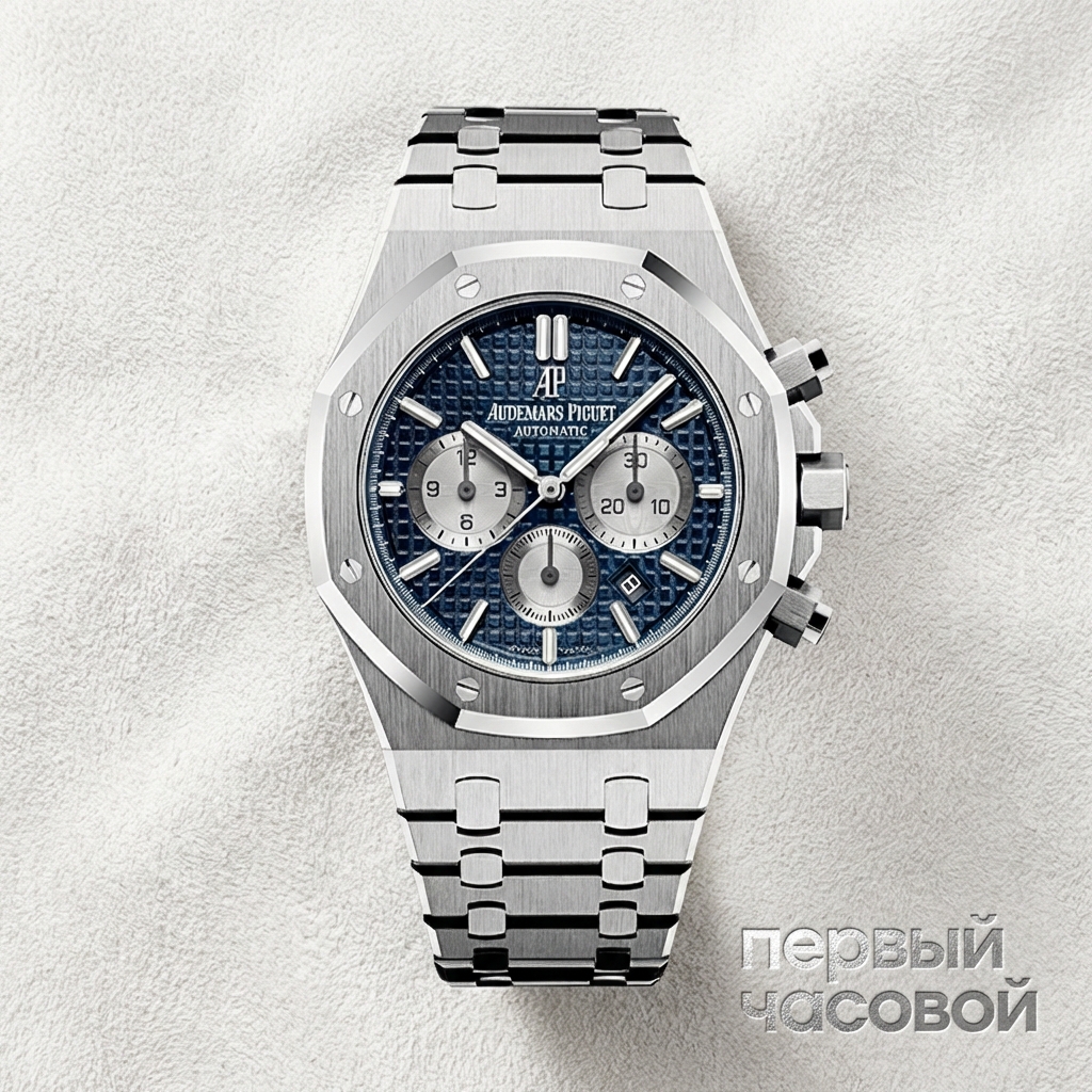 Audemars Piguet Royal Oak Chronograph представляет собой эталон архитектурного конструктивизма, воплощенный в 41-миллиметровом корпусе из нержавеющей стали. Геометрия модели определяется каноническим восьмиугольным безелем, фиксируемым восемью винтами из белого золота, которые создают визуальный ритм и контрастируют с вертикальным сатинированием фронтальных поверхностей. Сложная финишная обработка включает зеркальную полировку скошенных граней, подчеркивающую агрессивные линии интегрированного браслета и корпуса.