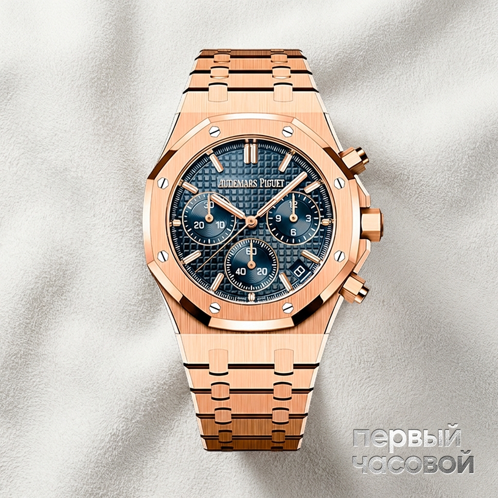 Audemars Piguet Royal Oak Chronograph являет собой квинтэссенцию спортивной роскоши, переосмысленной через призму современной мануфактурной механики. Корпус диаметром 41 мм, выполненный из 18-каратного розового золота, сохраняет каноническую архитектуру Жеральда Дженты: восьмиугольный безель с винтами из белого золота визуально закрепляет сложную геометрию сатинированных и полированных граней. Интегрированный браслет демонстрирует исключительную финишную обработку, где каждое звено играет со светом при малейшем движении запястья.