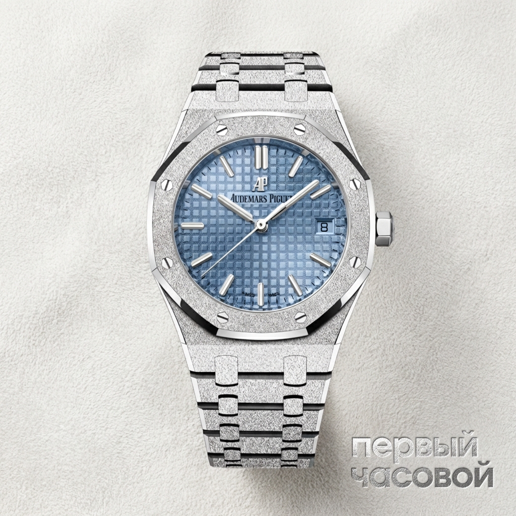 Циферблат декорирован фирменным узором Grande Tapisserie в светло-голубом оттенке, создающем холодный хроматический контраст с текстурированным металлом. Накладные часовые метки и стрелки Royal Oak из белого золота снабжены люминесцентным покрытием. Апертура даты расположена в традиционном положении на «3 часа».