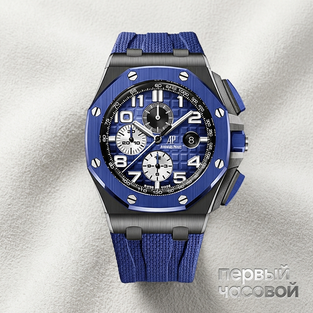 Audemars Piguet Royal Oak Offshore Chronograph в исполнении из синей керамики представляет собой радикальную эволюцию культовой спортивной линейки, где акцент смещен на физические свойства материалов. Корпус диаметром 44 мм сформирован из спеченной керамики, обработка которой требует длительного процесса алмазного фрезерования для достижения чередования сатинированных плоскостей и зеркально полированных фасок. Архитектура модели сохраняет характерную массивность: защитные выступы кнопок хронографа и заводной головки интегрированы в общий силуэт, подчеркивая индустриальную эстетику и герметичность до 100 метров.