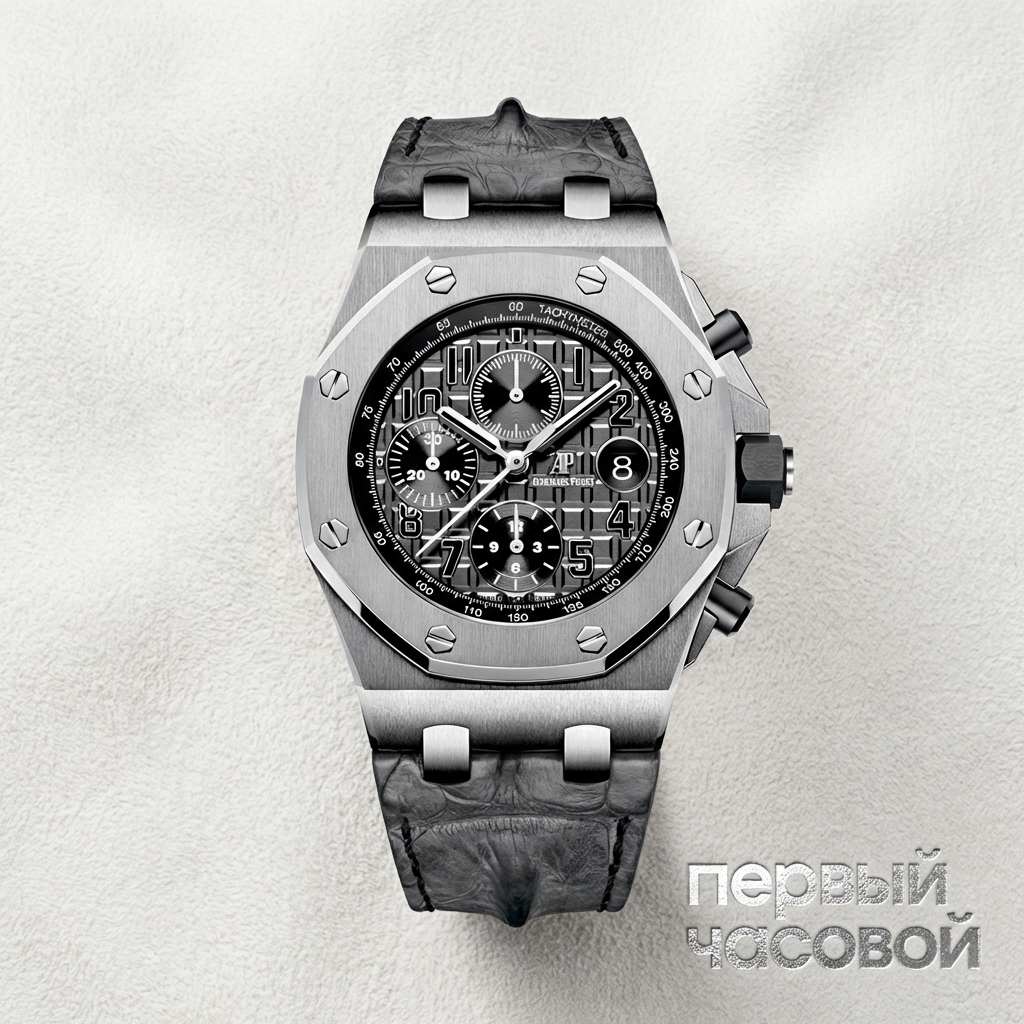 Audemars Piguet Royal Oak Offshore Chronograph представляет собой монументальную интерпретацию культового дизайна Жеральда Дженты, адаптированную под требования современной спортивной эстетики. Корпус диаметром 42 мм выполнен из нержавеющей стали с чередованием сатинированных поверхностей и полированных фасок, что подчеркивает геометрическую сложность конструкции. Характерный восьмиугольный безель, закрепленный видимыми винтами из белого золота, обрамляет циферблат грифельно-серого оттенка с фирменным гильоше «Méga Tapisserie». В данной референции мануфактура перешла от использования обрезиненных элементов к высокотехнологичной черной керамике для кнопок хронографа и заводной головки, что обеспечивает исключительную износостойкость тактильных зон.
