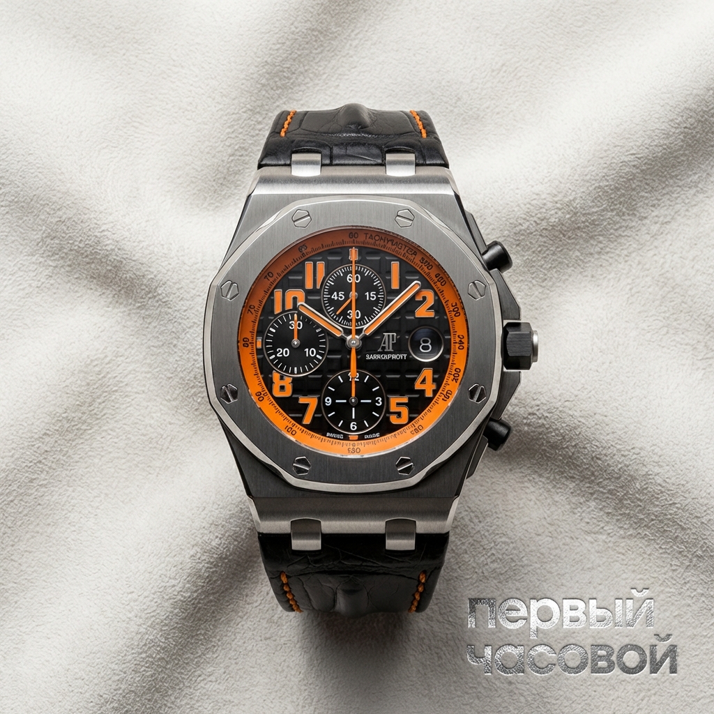 Audemars Piguet Royal Oak Offshore Chronograph в данной итерации представляет собой квинтэссенцию спортивного люкса середины 2000-х годов, известную в профессиональных кругах под наименованием «Volcano». Архитектура корпуса диаметром 44 мм выполнена из нержавеющей стали с характерным чередованием сатинированных поверхностей и полированных фасок, что подчеркивает геометрическую сложность конструкции. Визуальный центр композиции — циферблат с гильоше Méga Tapisserie глубокого черного цвета, на котором контрастно выделяются оранжевые арабские цифры и тахиметрическая шкала на внутреннем фланце. Безель, закрепленный восемью сквозными винтами из белого золота, является прямой отсылкой к наследию Жеральда Дженты, однако здесь он гипертрофирован для обеспечения визуальной мощи и защиты сапфирового стекла. Внутри корпуса интегрирован механический калибр с функцией хронографа и автоматическим подзаводом, отвечающий за точность измерения временных отрезков. Отсутствие заводского комплекта (коробки и документов) переносит фокус внимания исключительно на физическое состояние предмета и его аутентичность. Данный референс 26170ST является значимым эталонным образцом эпохи оверсайз-хронографов мануфактуры из Ле-Брассю.