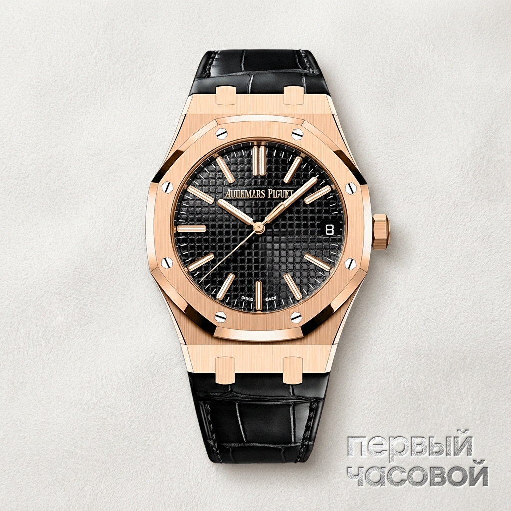 Корпус из розового золота 18к толщиной 41 мм, задняя крышка из сапфирового стекла, заводная головка с винтовой фиксацией, черный циферблат с узором Grande Tapisserie, часовые метки из розового золота и стрелки Royal Oak с люминесцентным покрытием, механизм калибра 4302 с автоподзаводом.
