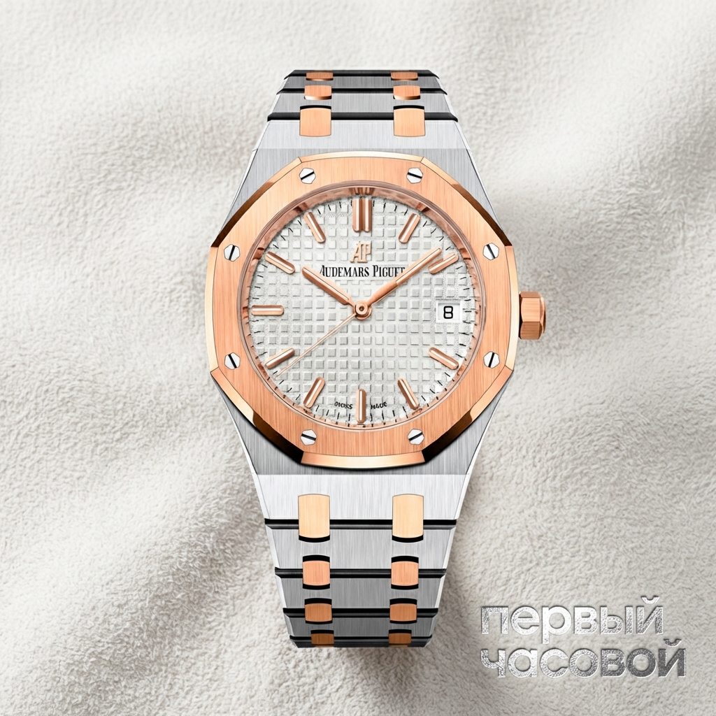 Циферблат декорирован классическим паттерном «Grande Tapisserie» серебристого тона, создающим эффект объемной текстуры благодаря гильошированию на пантографе. Накладные часовые индексы и стрелки Royal Oak выполнены из розового золота и заполнены люминесцентным составом для читаемости. Апертура даты лаконично интегрирована в положении «3 часа». Сердцем часов выступает автоматический калибр AP 5800, видимый сквозь сапфировую заднюю крышку. Механизм с ротором из розового золота обеспечивает запас хода до 50 часов и работает с частотой 4 Гц.