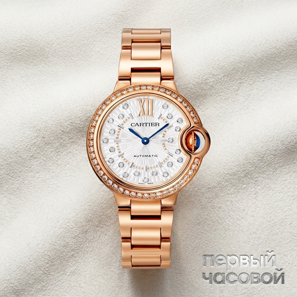 Cartier Ballon Bleu de Cartier демонстрирует отход от традиционной планарной геометрии в пользу объемных, сферических форм. Корпус диаметром 33 мм, выполненный из 18-каратного розового золота, представляет собой сложную архитектурную конструкцию, где выпуклое сапфировое стекло плавно перетекает в полированный металл.