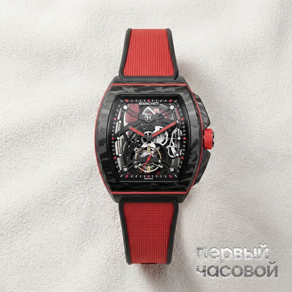 Часы Bianchet B1.618 представляют собой архитектурную интерпретацию принципов высокого часового искусства, где форма корпуса продиктована математическими законами золотого сечения. Бочкообразная конструкция размером 43 x 50 мм выполнена из высокотехнологичного карбонового волокна, что обеспечивает изделию минимальный вес при высокой структурной жесткости. Текстура композитного материала создает уникальный визуальный рисунок, лишенный глянцевого блеска, что подчеркивает технократичный характер модели. Толщина корпуса составляет 13 мм, что в сочетании с изогнутым профилем обеспечивает эргономичное прилегание к запястью.