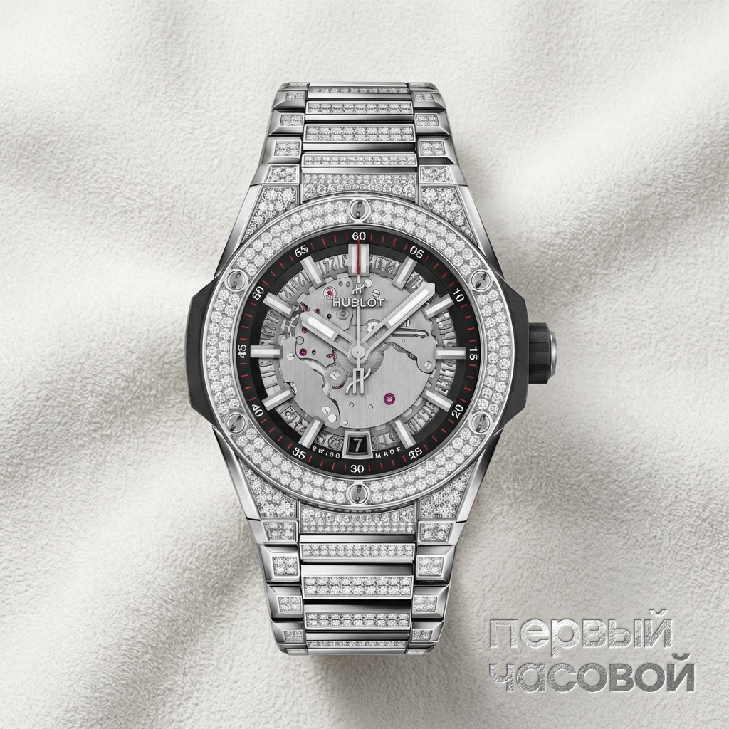 Техника и носка. Титан здесь решает главную проблему ювелирных часов — вес. Полное паве (код 3704 означает заводскую усыпку камнями корпуса и браслета) в золоте весило бы как кастет, а в титане это вполне носибельная история на каждый день. Качество закрепки у Hublot традиционно высокое, камни не выпадают от случайных ударов. То, что часы в пленках — огромный плюс. Титан царапается специфически, и полировать его сложнее, чем сталь, поэтому «девственное» состояние корпуса здесь стоит денег.