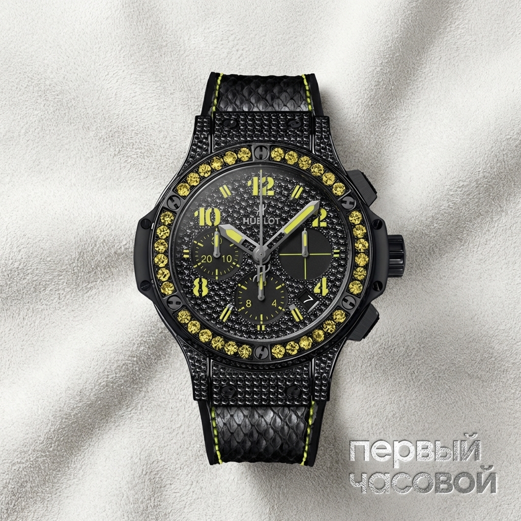 Hublot Big Bang в корпусе диаметром 41 мм демонстрирует строгий подход мануфактуры к интеграции контрастных материалов. Архитектура многокомпонентного корпуса базируется на использовании PVD-покрытия, формирующего матовую монохромную базу. Индустриальная геометрия безеля с шестью H-образными титановыми винтами нивелируется инкрустацией сапфирами багетной огранки, где оптические свойства камней создают сложную игру света на темном фоне. Под сапфировым стеклом расположен многоуровневый циферблат с тремя субдайлами хронографа и апертурой даты. За работу усложнений отвечает калибр с автоматическим подзаводом.