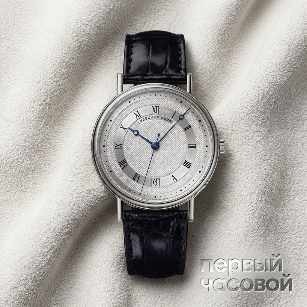 Часы Breguet Classique представляют собой квинтэссенцию академического часового искусства в корпусе диаметром 36 мм из белого золота. Архитектура модели характеризуется фирменным рифлением боковой грани корпуса (cannelures), создающим сложную игру света и тени, а также прямыми припаянными ушками, типичными для мануфактуры. Циферблат из цельного золота с серебрением декорирован вручную гильошированным узором «парижские гвозди», что обеспечивает высокую читаемость вороненых стрелок с наконечниками «яблоко Бреге» и римских цифр. Апертура даты лаконично интегрирована в положение «6 часов», сохраняя визуальный баланс композиции. Сапфировое стекло защищает автоматический калибр, конструкция которого обеспечивает высокую точность хода при сохранении малой толщины корпуса.