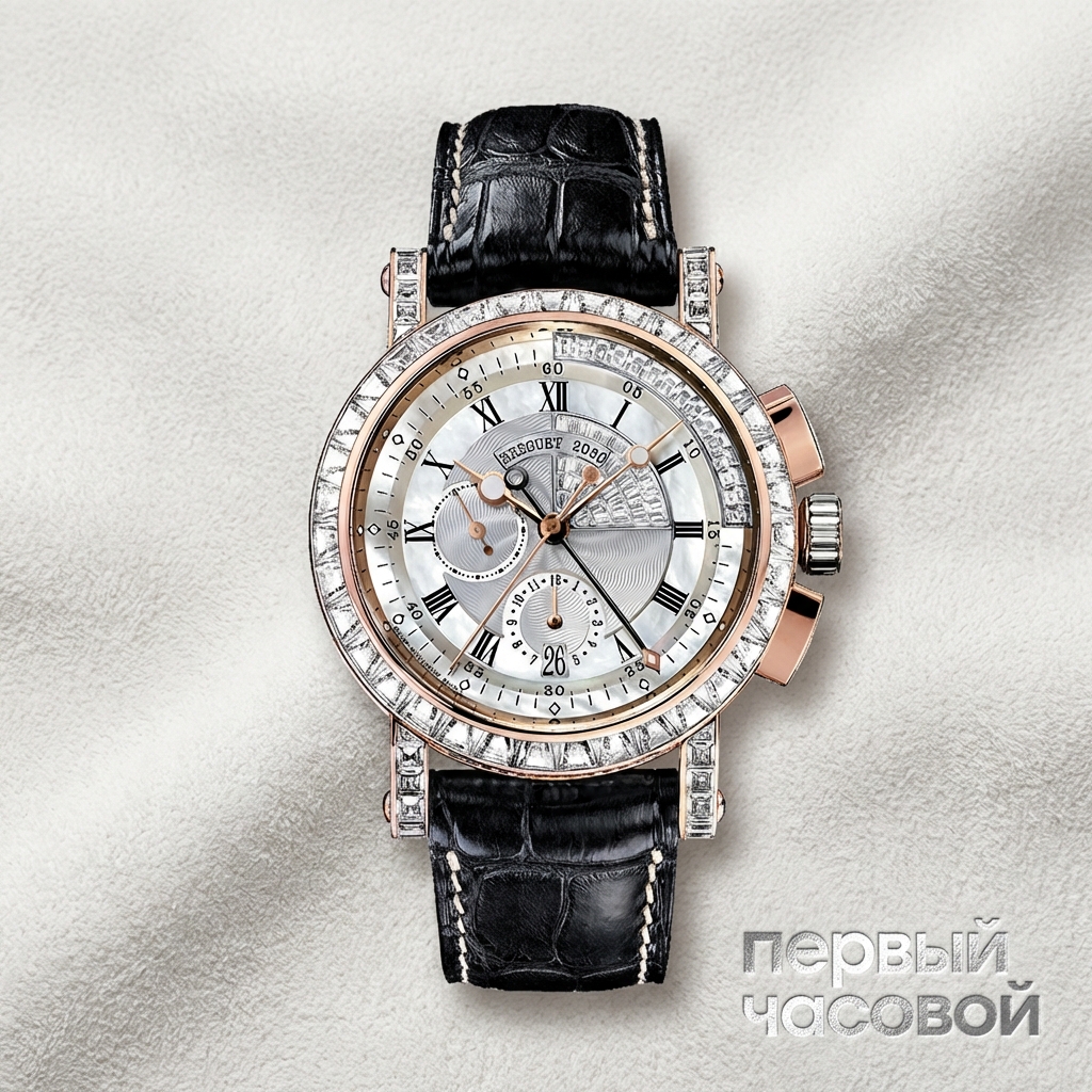 Breguet Marine Chronograph High Jewellery представляет собой редкий образец синтеза утилитарной морской эстетики и высокого ювелирного искусства. Корпус диаметром 42.2 мм, выполненный из 18-каратного розового золота, отличается сложной геометрией с фирменным рифлением на боковых гранях (cannelures), дополненным инкрустацией бриллиантами на безеле и ушках. Драгоценная отделка меняет архитектурное восприятие модели, смещая акцент с инструментальной функции на декоративную ценность материалов.
