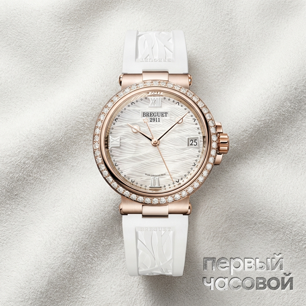Breguet Marine Dame представляет собой современную интерпретацию морского наследия мануфактуры, реализованную в корпусе из 18-каратного розового золота диаметром 33,8 мм. Архитектура модели сохраняет традиционное рифление боковых граней корпуса, характерное для эстетического кода бренда, в то время как безель инкрустирован бриллиантами классической огранки, создающими игру света вокруг циферблата. Сам циферблат из натурального перламутра украшен сложным гильошированным узором marea, имитирующим морские волны, и дополнен накладными римскими цифрами, а также фирменными стрелками Бреге с наконечниками «pomme» и люминесцентным составом. Работа часов обеспечивается мануфактурным калибром 591A с автоматическим подзаводом, кремниевой спиралью и ротором из золота, декорированным вручную, что можно наблюдать через сапфировую заднюю крышку. Комплектация белым каучуковым ремнем с текстурным узором подчеркивает спортивно-утилитарный статус модели, сохраняя при этом принадлежность к классу haute horlogerie.