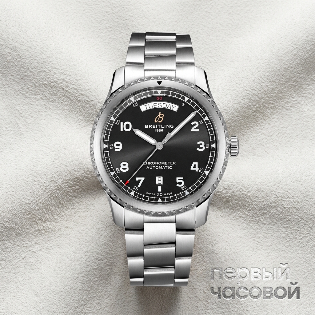 Перед нами Breitling, который пытается быть понятным, а не перегруженным. Модель Aviator 8 (или Navitimer 8 в ранних итерациях) — это попытка уйти от сложного циферблата с логарифмической линейкой к чистой читаемости. Для повседневной носки это плюс: время считывается мгновенно, а компоновка «день-дата» (как у Rolex President, но в стали) добавляет очков к удобству в офисном режиме.
