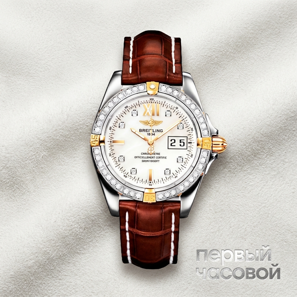 Breitling Galactic 41 являет собой пример монументальной архитектуры корпуса, выполненной в биколорном сочетании сатинированной стали и полированного желтого золота. Геометрия 41-миллиметрового кейса акцентирована вращающимся безелем с заводской инкрустацией бриллиантами, создающими сложную игру света и визуально облегчающими массивный профиль часов. Под сапфировым стеклом с двусторонним антибликовым покрытием расположена характерная для калибра Breitling 49 двойная апертура большой даты, доминирующая в верхней части циферблата. Механизм, сертифицированный хронометр, обеспечивает запас хода до 42 часов и помещен в корпус с водонепроницаемостью до 300 метров, что технически классифицирует изделие как профессиональный инструмент для погружений, несмотря на декоративную отделку. Завершает композицию кожаный ремень, интегрированный в ушки корпуса с характерным для бренда запасом прочности.
