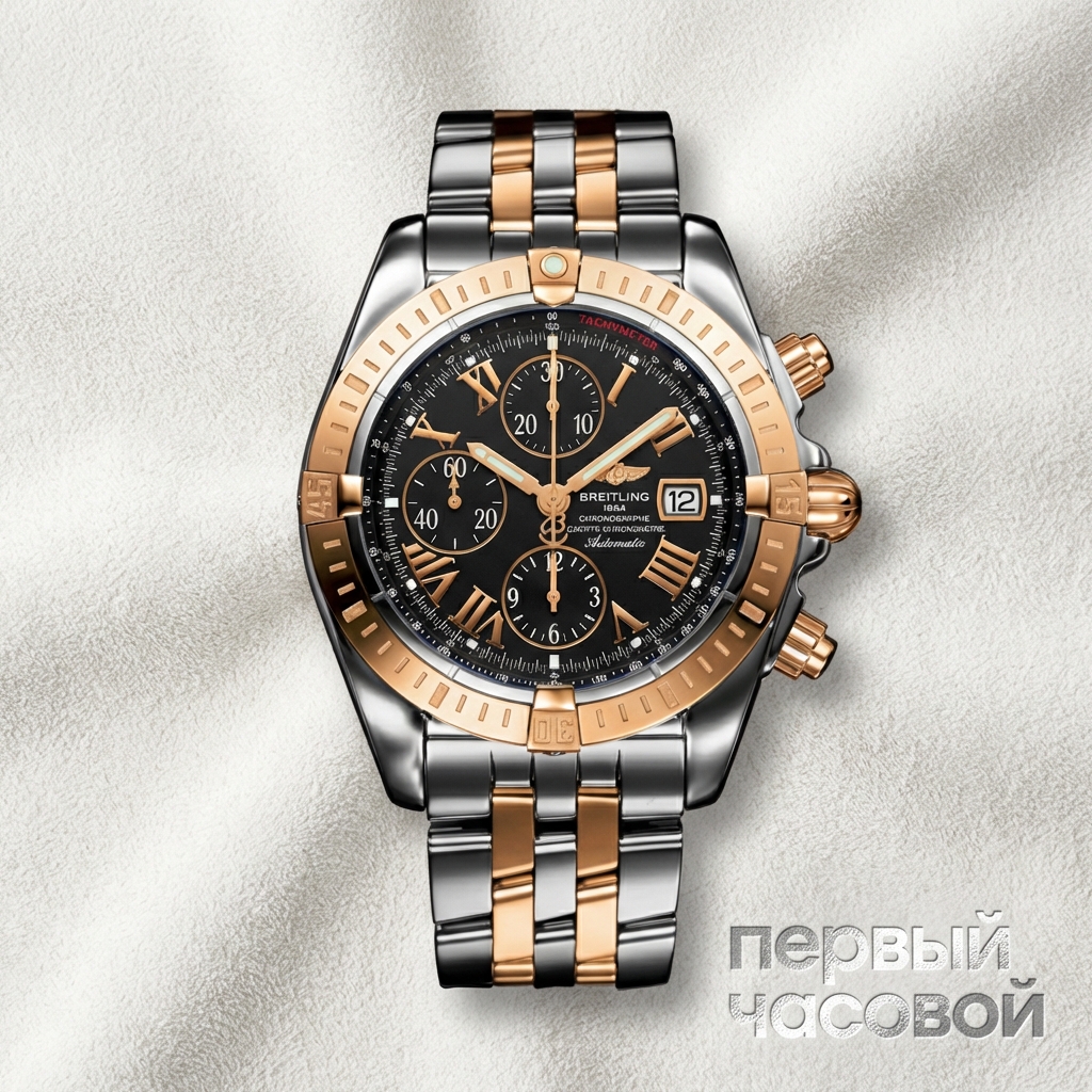 Chronomat Evolution в биколоре — это мастодонт из середины нулевых, когда Breitling делали часы максимально заметными и тяжелыми. Сразу к фактам: 44 миллиметра здесь честные и ощущаются на все 46 из-за высоты корпуса и массивного безеля. Золотые вставки (буква C в референсе) добавляют веса и статуса, но будьте готовы к тому, что зеркальная полировка ловит «паутинку» от любого соприкосновения с манжетой.