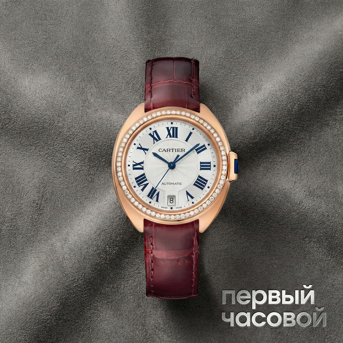 «Мне нравится линейка Cl? за их нестандартный подход к заводной головке — она здесь ключ, а не "пуговица", отсюда и название. Эти часы в 35-м корпусе из розового золота — честный выбор для девушки, которая не хочет носить заезженный Ballon Bleu или Tank, как у половины светской Москвы. Бриллианты по безелю заводские, камни чистые, Cartier на этом никогда не экономит, так что блеск будет правильный, а не дешевый.