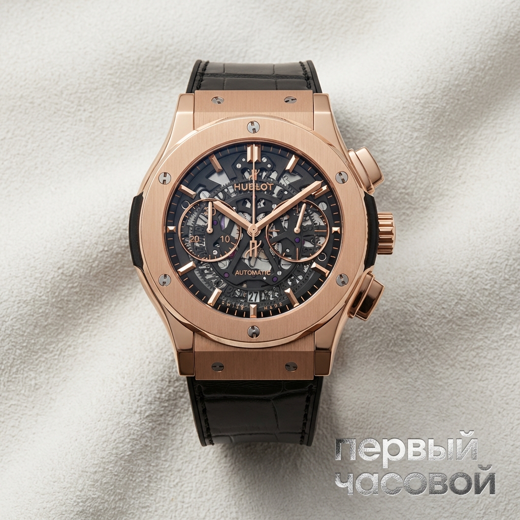 Внутри стоит калибр HUB1155. Если отбросить маркетинг, это надежная база на архитектуре Sellita/ETA с модулем хронографа. Это не мануфактурный калибр высокого часового искусства, но надежный «трактор», который дешев и прост в обслуживании, что для владельца скорее плюс. Читаемость циферблата, как у любого скелетона, страдает в угоду эстетике — стрелки теряются на фоне шестеренок, так что время считывается не мгновенно. Важный момент по данному лоту: часы абсолютно новые, в пленках, но без коробки и документов. Это существенно снижает их инвестиционную привлекательность для перепродажи, но делает их отличным вариантом для покупки «под себя», если вы хотите носить золото, а не хранить макулатуру в сейфе.