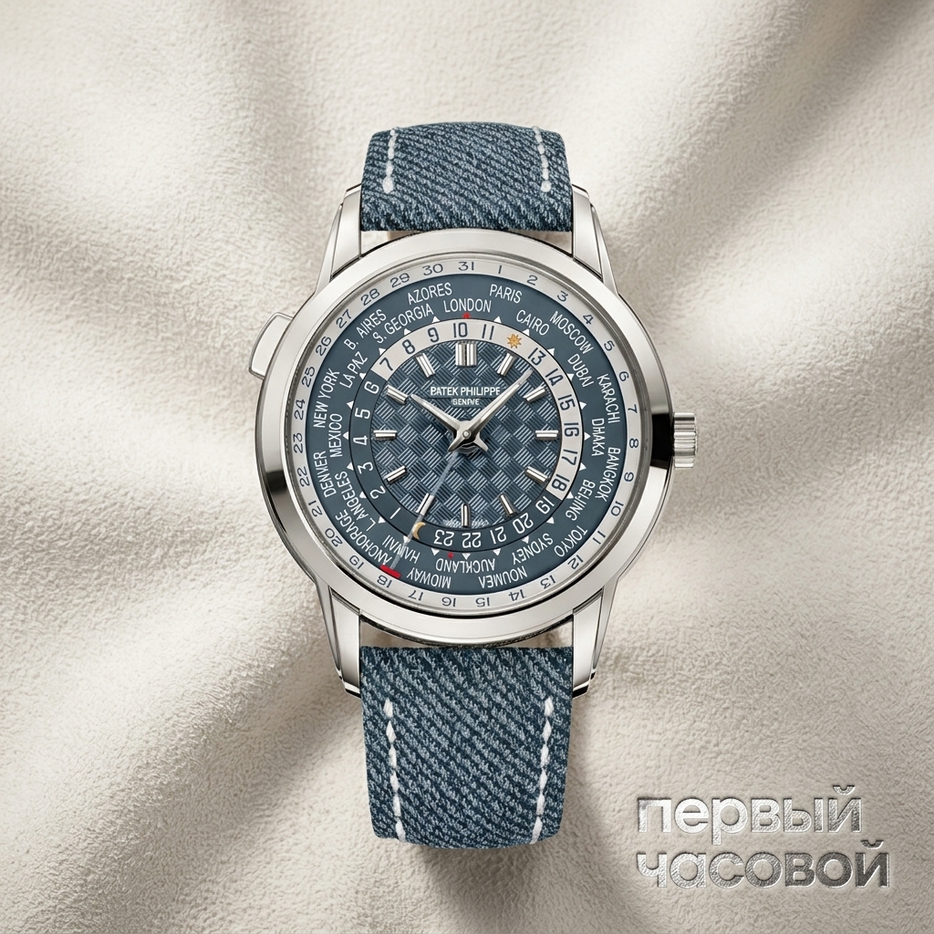 Patek Philippe World Time в корпусе из белого золота маркирует важнейший этап в эволюции мануфактурных усложнений. Архитектура 40-миллиметрового корпуса демонстрирует строгую геометрию ступенчатых ушек и гладкого безеля, обеспечивающих точное преломление света на поверхности металла. Циферблат представляет собой сложную многоуровневую структуру: периферийный диск городов и 24-часовая шкала обрамляют центральный сегмент, где интегрирована индикация даты, синхронизированная с местным временем. Сквозь сапфировое стекло задней крышки открывается панорамный обзор на калибр 240 HU C с золотым микроротором. Механизм декорирован согласно канонам высокого часового искусства, демонстрируя выверенный англаж мостов и фактурную обработку деталей. Завершает композицию плотный тканевый ремешок, который переводит историческое усложнение в парадигму современной утилитарной физики.