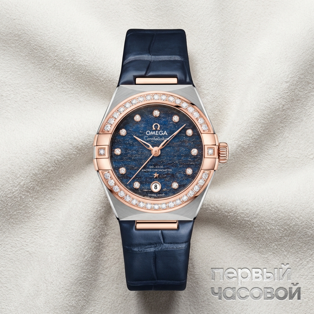 Omega Constellation демонстрирует современную эволюцию архитектоники линейки Manhattan, характеризующуюся узнаваемыми скобами «griffes» и интегрированной геометрией ушек. Корпус диаметром 29 мм выполнен в биколорном сочетании нержавеющей стали и запатентованного 18-каратного сплава Sedna Gold, обладающего уникальным красноватым оттенком и повышенной устойчивостью к потускнению. Безель инкрустирован бриллиантами классической огранки, создающими визуальный контраст с сатинированными поверхностями металла.