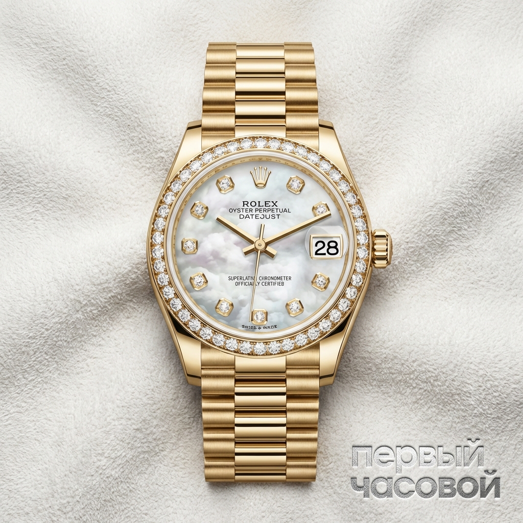 Начнем с фактов, которые нельзя игнорировать. Перед нами полностью золотой Datejust 31 с заводскими бриллиантами (референс RBR), абсолютно новый, в пленках, но без коробки и документов. Это создает специфическую ситуацию на рынке. Обычно «новые в пленках» подразумевают полный фулл-сет для инвестора, здесь же мы имеем дело с часами для носки, а не для сейфа.