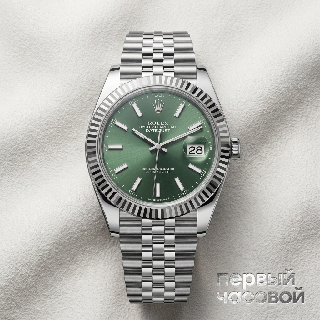 Сразу к делу. Перед нами одна из самых востребованных конфигураций Datejust 41: сталь, белое золото, синий циферблат и браслет Jubilee. Это «золотой стандарт» ликвидности Rolex, но конкретно этот референс усложнен заводскими бриллиантами на метках. Камни здесь не выглядят вычурно, они добавляют часам веса и визуальной глубины, хотя и немного сужают круг потенциальных покупателей на вторичке по сравнению с обычными индексами.
