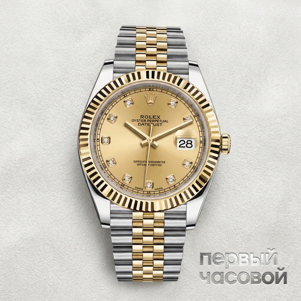 Rolex Datejust 41 воплощает собой синтез классической архитектуры Oyster и ювелирной эстетики, характерной для референсов с использованием драгоценных камней. Корпус диаметром 41 мм выполнен в концепции Yellow Rolesor, сочетающей конструкционную прочность стали Oystersteel с благородством 18-каратного желтого золота на безеле и заводной головке. Рифленый безель создает характерную игру света, визуально поддерживаемую циферблатом цвета шампанского, где апертура даты под линзой Cyclops соседствует с десятью бриллиантами, инкрустированными в золотые оправы. Внутри корпуса функционирует мануфактурный калибр 3235 с запатентованным ходом Chronergy, обеспечивающим повышенный КПД и запас хода до 70 часов. Несмотря на отсутствие оригинальной документации и футляра, лот сохранил полную заводскую комплектацию защитных пленок, подтверждающую его нетронутое состояние и отсутствие эксплуатационного износа.