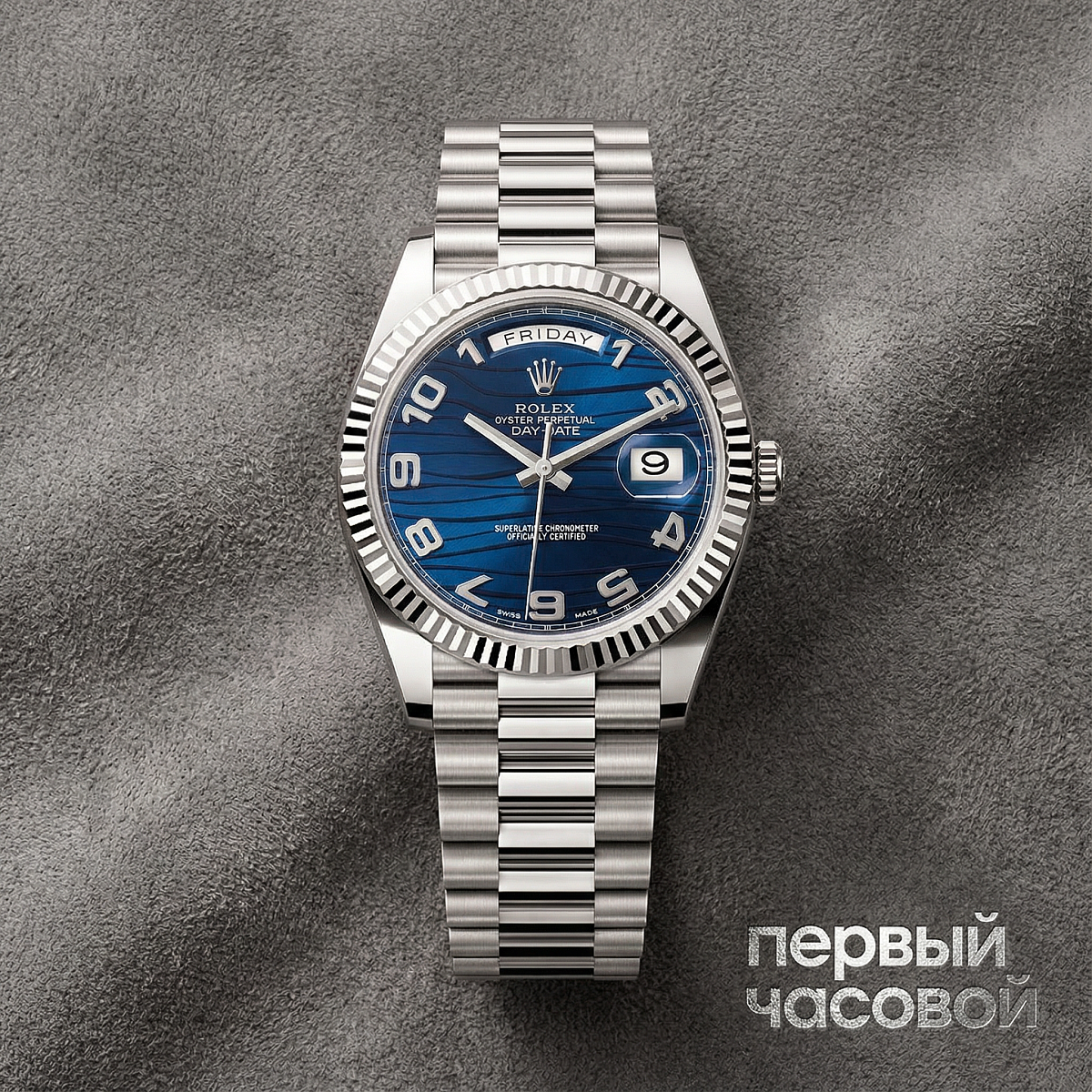 «К сороковому диаметру Day-Date рынок привык быстро, а вот 41 мм (Ref. 218239) — это уже история для тех, кто любит чувствовать вещь на запястье. В белом золоте этот корпус весит прилично, но именно такая тяжесть говорит о статусе громче любых логотипов. Главная "фишка" конкретно этого лота — циферблат Blue Waves. Это не скучный классический синий, а фактурный узор, который вживую смотрится на голову выше стандартных версий и встречается гораздо реже.