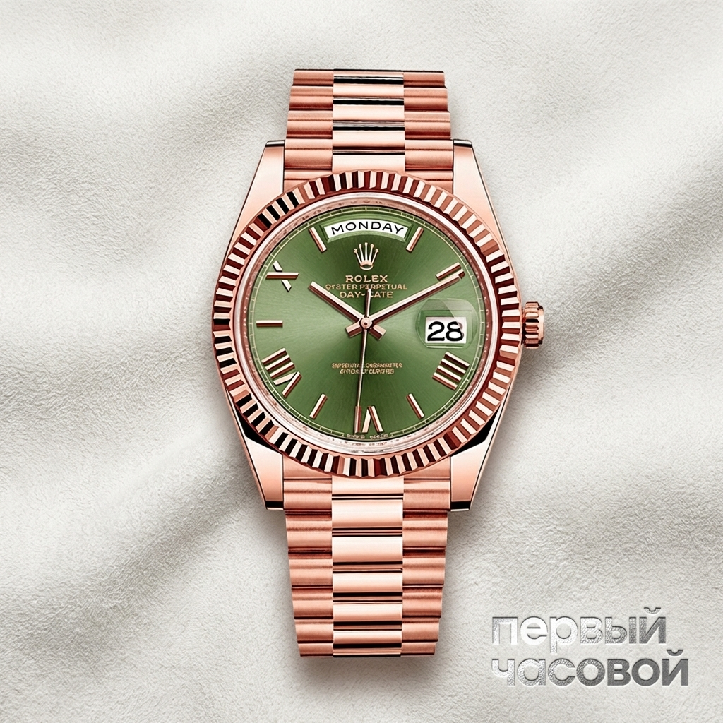 Часы Rolex Day-Date демонстрируют эволюцию классической архитектуры мануфактуры, сохраняя традиционные пропорции в 40-миллиметровом корпусе из розового золота.