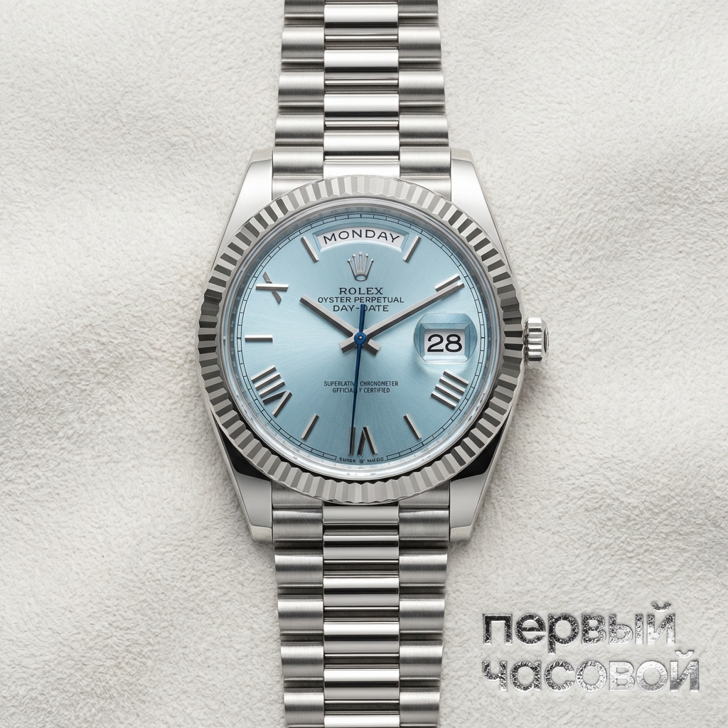 Rolex Day-Date в платине — это тяжелая артиллерия в буквальном и переносном смысле. Сразу предупреждаю: если вы привыкли к легким часам, вес платины на запястье может удивить. Это не та модель, о которой забываешь в течение дня, но именно эта тяжесть для многих является синонимом ценности. Циферблат Ice Blue здесь работает как система «свой-чужой»: издалека часы выглядят как сталь, и только знающий человек поймет, что перед ним топ линейки Rolex по цене элитной недвижимости.