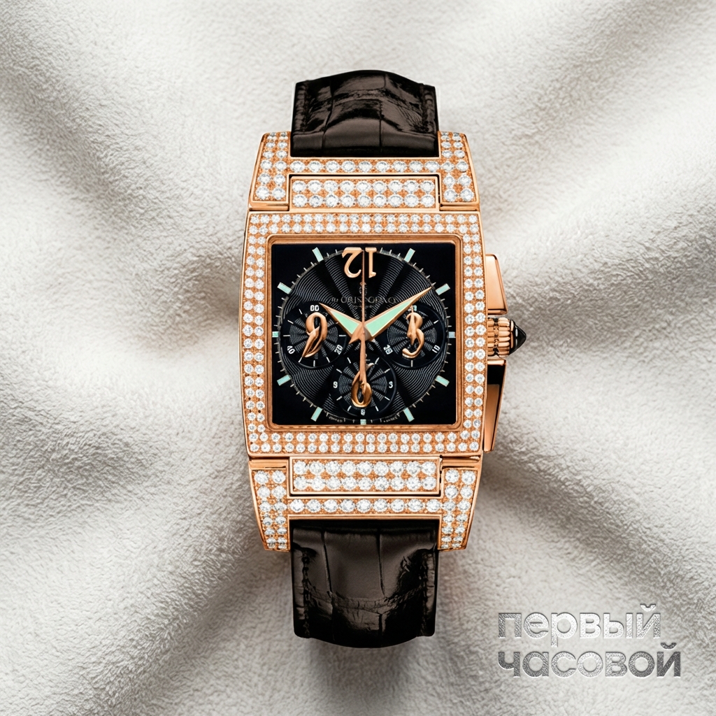 De Grisogono — это история не про хронометраж, а про вес золота и чистоту камней. Перед нами модель Instrumento No. Uno в версии хронографа. Сразу надо понимать габариты: 55 мм по ушкам — это очень много. Часы имеют изогнутый профиль, но на узком запястье могут смотреться громоздко, эргономика здесь принесена в жертву визуальному эффекту. Это чистый «statement piece» для вечернего выхода, а не часы на каждый день под джинсы.