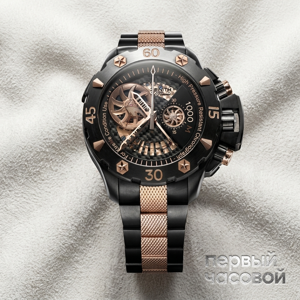 Это Zenith Defy Xtreme из весьма специфической эпохи нулевых. Габариты в 46.5 мм и сложный сэндвич из титана, черного PVD и желтого золота делают эти часы тяжеловесным инструментом на любителя. На руке они сидят как кусок бронетехники. Практичность здесь спорная: золотые элементы быстро собирают микроцарапины, а восстановить первоначальное комбинированное покрытие корпуса при полировке без потери заводской геометрии крайне тяжело. Заявленная водозащита в 1000 метров — чисто техническая избыточность, которая превратила корпус в толстую шайбу, навсегда закрыв этим часам путь под манжету классической рубашки.